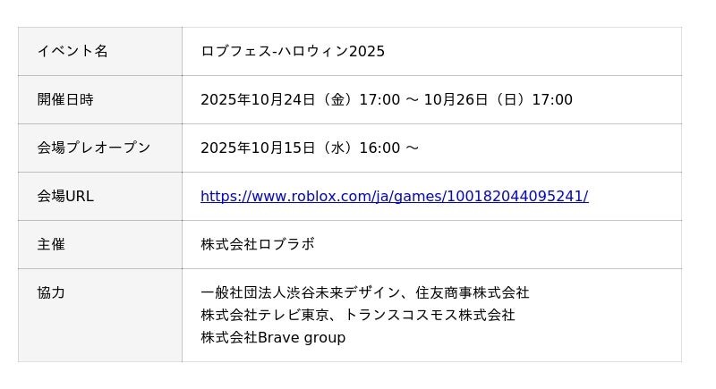 株式会社ロブラボは、世界最大級のメタバースプラットフォーム「Roblox」内において、期間限定イベント「ロブフェス‐ハロウィン2025」を開催いたします。