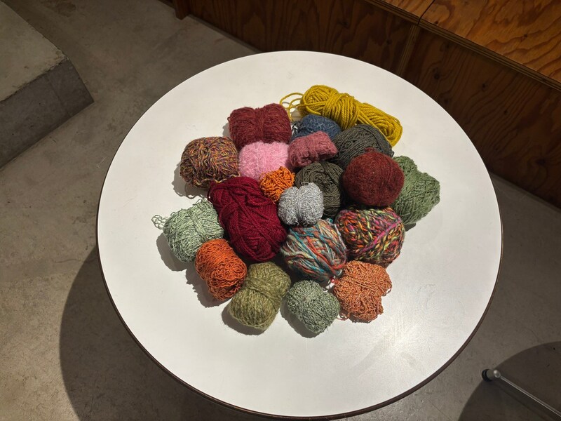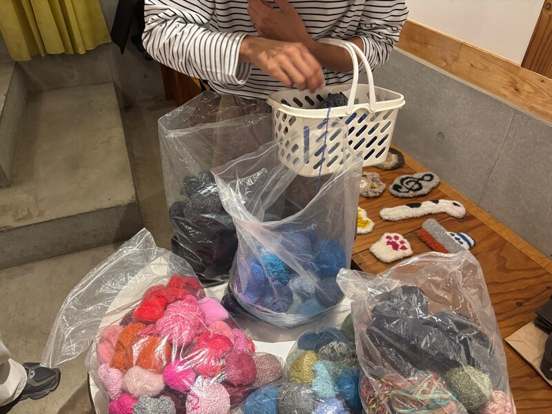 ワークショップに使用する毛糸は、アパレル企業や工場から廃棄されるサンプルの布を解いて再利用しているとのこと。環境に配慮しつつ、ラメやカラフルなミックスカラーなど、市販では手に入らないような個性的な毛糸が並ぶその様子はまるで、駄菓子屋さんでお菓子を選ぶ時の感覚に似ており、童心に返ったようなワクワクを感じられた。
