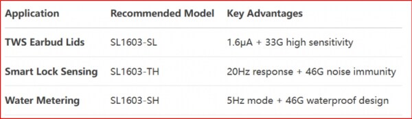 「TWSイヤホンの蓋開閉検知アプリケーションにおいて、SL1603SL(5Hz + 33G)はバッテリー寿命を18ヶ月に延長します」と、Slkorのチーフプロダクトエンジニアは述べています。「その無極性応答により、磁極の方向に関する課題が解消されます」