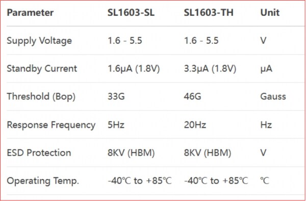 先進的なセンサー技術のリーダーであるSlkorは本日、新しい超低消費電力ホールスイッチセンサーである SL1603SL https://www.slkoric.com/hall-effect-sensor/sl1603sl-hall-sensor-sot-23/2036/#desc シリーズ を発表しました。業界をリードする1.6μA@1.8Vのスタンバイ電流(5Hz版)、無極性(オムニポーラ)磁気応答、デュアル選択可能なスレッショルド(33G/46G)を特徴とし、このソリューションは空間に制約のあるバッテリー駆動デバイス向けに高精度の非接触検知を実現します。TWSイヤホン、スマートロック、その他のコンパクトなアプリケーションにおいて、エネルギー効率を40%向上させます。