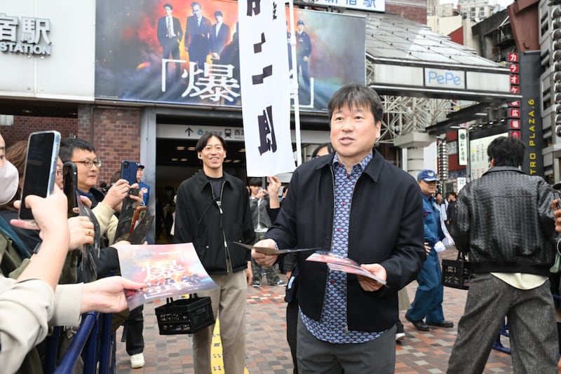 「『爆弾』観てください、お願いします!」と笑顔で声をかけながら、自らの手でチラシを配布した。
