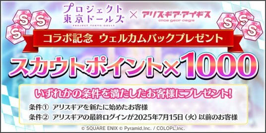 『プロジェクト東京ドールズ』とのコラボ開催を記念して、ゲームを新規で始めてくれたお客様と、復帰してくれたお客様を対象に、ゲーム内アイテム「スカウトポイント」をプレゼント中です。