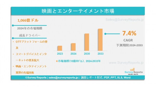 Surveyreportsの専門家が映画およびエンターテインメント市場の調査を分析したところ、2024年の映画およびエンターテインメント市場規模は1066億米ドルに達することが分かった。さらに、映画およびエンターテインメント市場のシェアは、2033年末までに2016億米ドルに達すると予測されている。映画およびエンターテインメント市場は、2024年から2033年の予測期間中に、年間平均成長率(CAGR)約7.4%で成長すると予測されている。