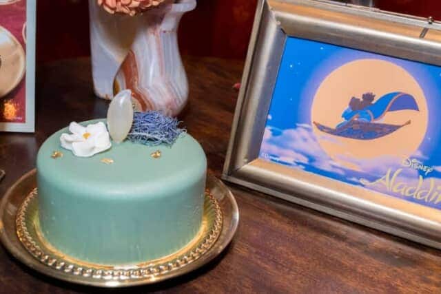真っ白なジャスミンの花が飾られ、魔法の絨毯は小麦粉を麺状にしたカダイフで表現。スポイトに入ったレモンシロップをかけると色が変わり、ジーニーのいたずらを表現した驚きのケーキです。全体をジャスミンが香るホワイトチョコレートガナッシュでコーティング。ピスタチオを使ったムースや、オレンジやカシス、刻み洋梨のコンポートを使ったジュレの風味が、口いっぱいに広がります。