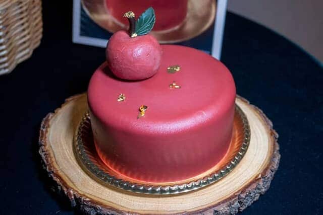 真っ赤なケーキは『白雪姫』。赤いチョコレートでコーティングされたケーキの中には、白雪姫の純粋さを表わす白いクリームチーズのババロアと、5種のスパイスを使って12時間煮込んだリンゴのコンポートやイチゴ、土台に使ったほろ苦いキャラメルのストロイゼルなどが重なり、ひと口ごとに物語の情景を感じられるケーキです。トッピングの “毒リンゴ” もぜひ味わってみてください。