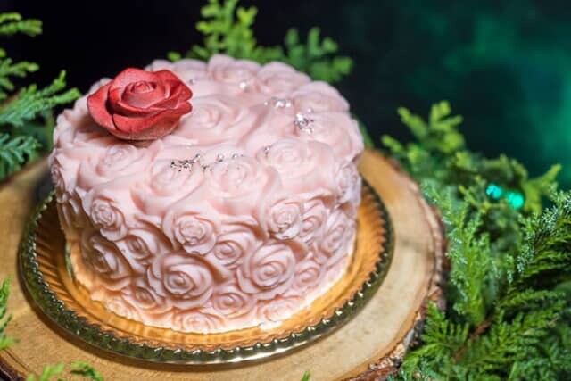 オーロラ姫の美しさや優しさを、薔薇をかたどったライチとラズベリーのムースで包んだケーキ『眠れる森の美女』。妖精の魔法の余韻を表現したムース層や “愛する人のキスで目覚める” ポッピングキャンディの刺激など、7つの層で物語を表現。バラとラベンダーのやさしい香りが、オーロラ姫の目覚めの瞬間を彩ります。