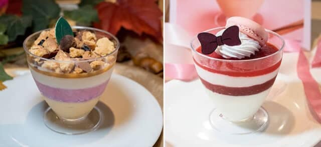 ▲『チップ&デール』の「Trésor d’Automne 洋梨とベリーのミルクティーパルフェ」と『おしゃれキャット』(マリー)の「Fleur de Chat ベリーチーズとブラマンジェのパルフェ」各¥1,296(税込)