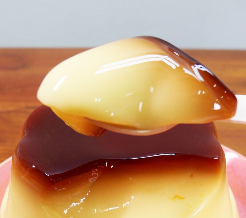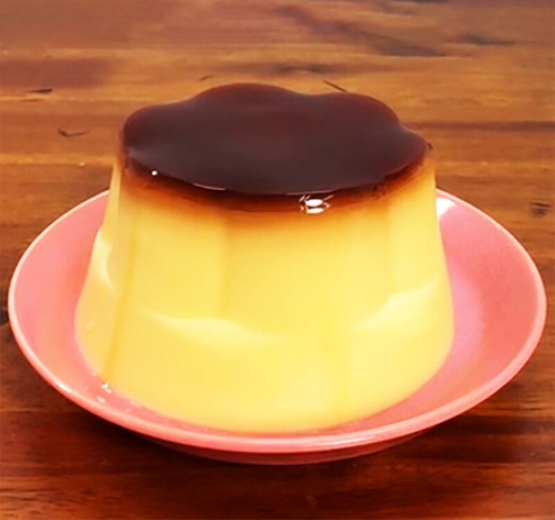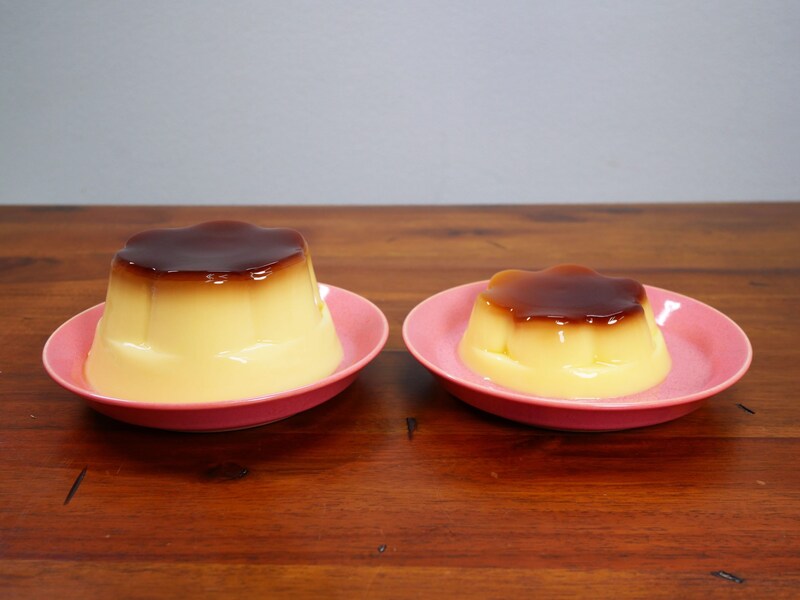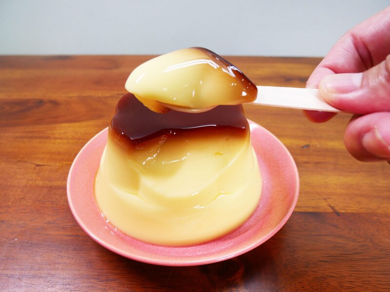 そして、底面のピンを折って空気を通し、プリンを皿に着地させます。