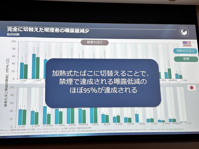 紙巻たばこの煙と比較して、IQOSから発生するエアロゾルに含まれる有害性成分の量は平均して約95%低減しているという化学的分析が報告されている。