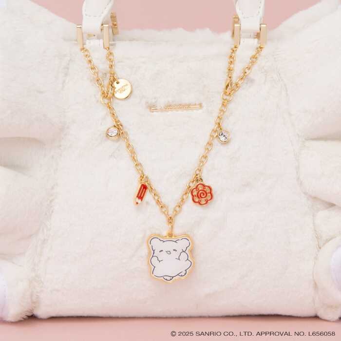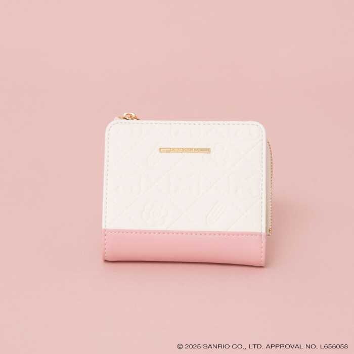 ショルダーバッグ19,800円はポケット付きで機能的。ぬいぐるみチャーム3,850円はハート型バッグを持ったはなまるおばけが可愛い♡折財布16,280円はピンク×アイボリーの配色で高級感も◎。