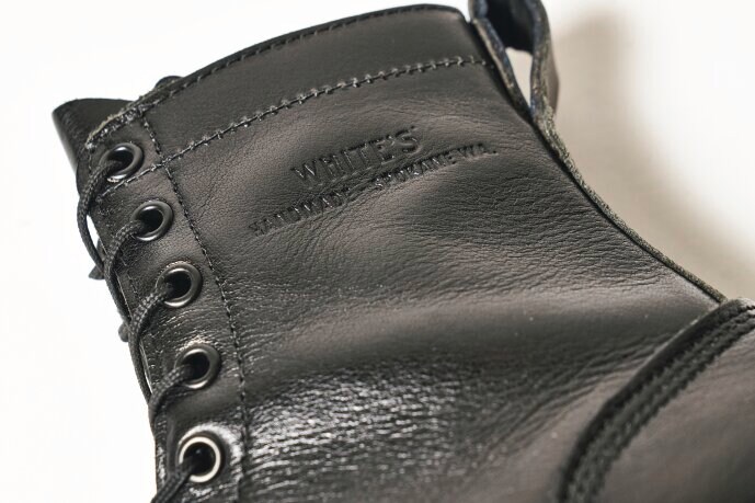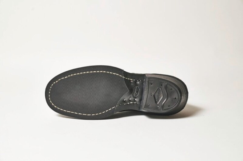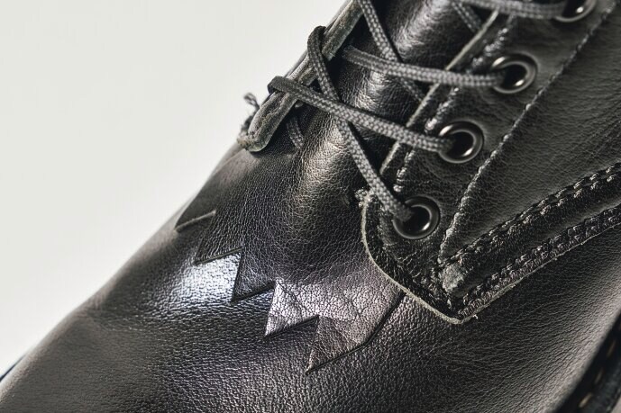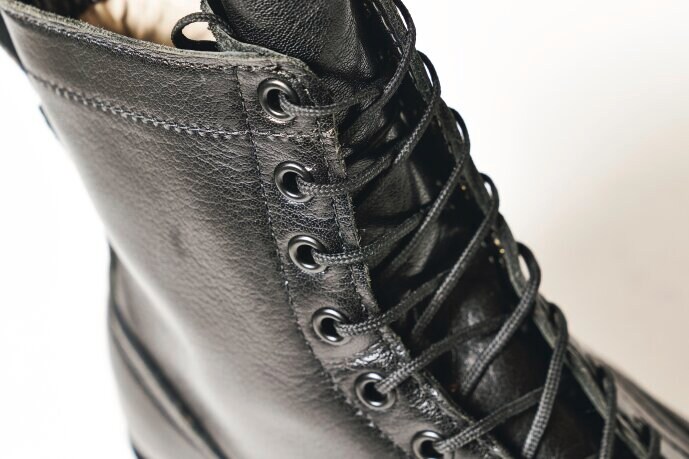 アッパーのブラックレザーとともにアイレットもブラックで統一することでトーンを合わせた。フックタイプにもカスタム可能だ。