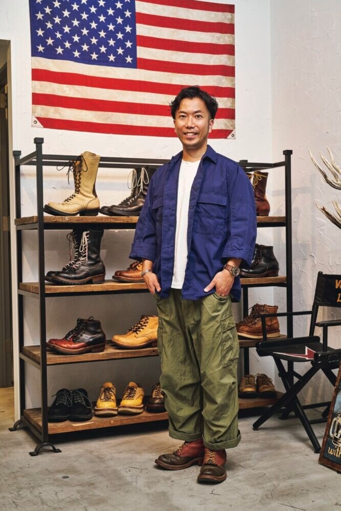 「スタンプタウン銀座」久野健作さん。スタンプタウン銀座にてリクラフターとして活躍する久野さん。これまで数々のホワイツブーツをカスタムオーダーし、愛用してきたなかでも、1番のお気に入りは唯一、トゥーバグステッチを入れることができるオリジナルパッカーなのだとか。