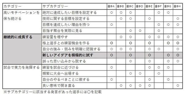 その結果、多くの選手が共通してブレークスルーのために重要だと感じている事柄が浮かび上がってきました。まず欠かせないのは、練習の質を高め、競技力を継続的に高めていくことです。そして、成長につながる負荷のかかった練習に日々取り組むためには、高いモチベーションを保ち続けることが求められます。さらに「練習ではできるのに、試合では上手くいかない」という現象が起こるように、身につけた実力を試合で発揮できるようになることも大切です。
