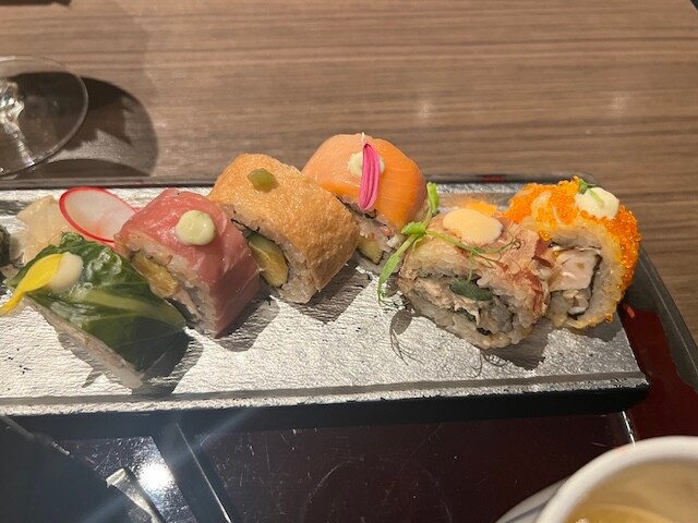 料理を監修したのは、“腸活栄養士”。 銀座の料理長が手がけた御膳には、まるで宝石のような ロール寿司8種が並びます。おかか、スモークサーモン、イタリアン、広島菜、鰻など、彩りも味わいも個性豊か。