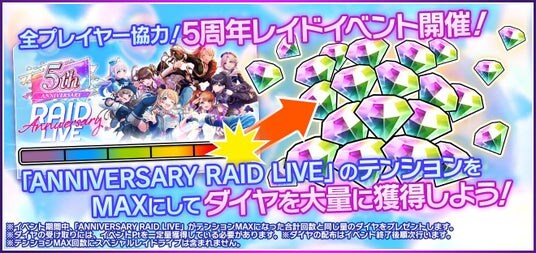イベント開催期間中、テンションがMAXになった「ANNIVERSARY RAID LIVE」の累計数に応じてダイヤがもらえる全プレイヤー協力型のキャンペーンを実施いたします。イベントポイントの累計達成報酬である「ダイヤ交換券」を獲得したユーザーが対象です。ぜひご参加ください!