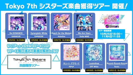 さらに、本日18:00より、『Tokyo 7th シスターズ』楽曲7曲を獲得できる「Tokyo 7th シスターズ楽曲獲得ツアー」を開催します。