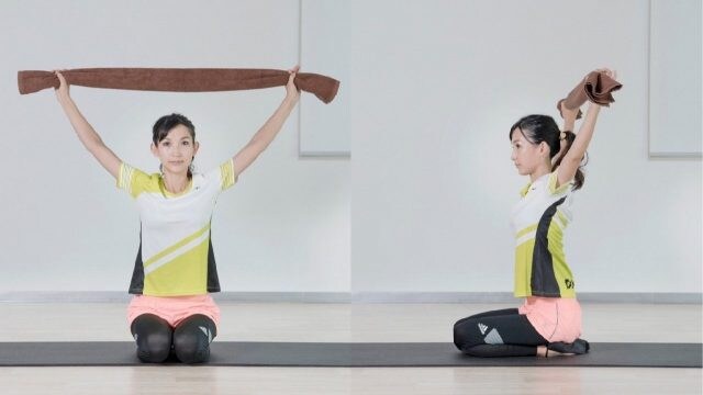 (1)肩幅より広めにバスタオルを持って両腕を上げる