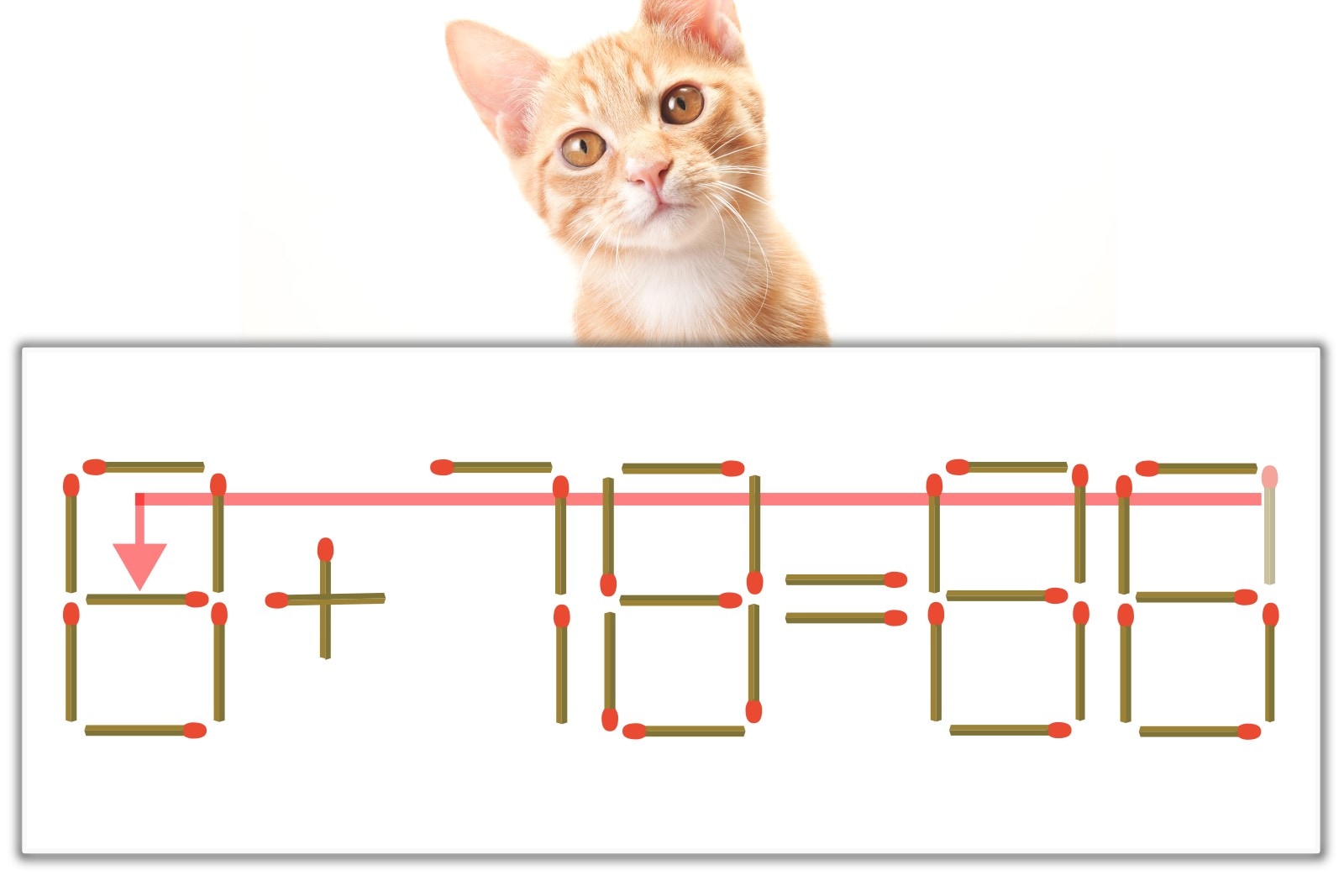 解答の「8」を別の数字に変化させると答えが導き出せます。解答の「8」のマッチ棒を一の位へ移動して「0」を「8」にしてみましょう。すると、「8+78=86」が成立します。