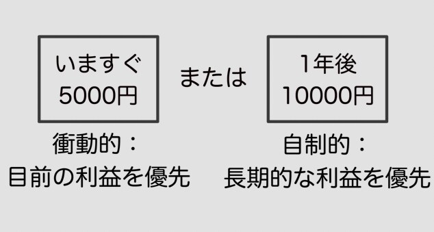 反対に「1年後に1万円をもらう」を選んだ場合は、長期的な利益を優先した「自制心」の強いタイプと判断されます。