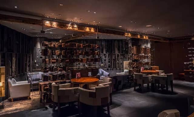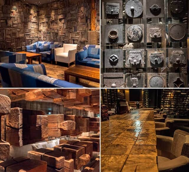 膨大な量の古本を重ねた壁や、古民家の梁や柱の付け根ばかりを飾ったり、和菓子を作る木製の型や商家で使われていたような古い錠前を並べたりと、京都の人の営みと歴史を感じる装飾が見事。青いパッチワークが鮮やかなソファーも杉本貴志氏がこだわったオリジナルの家具。そして古い木材を敷き詰めたバーカウンターは、カクテルを飲みながらついつい目で追い、指でなぞってしまうほど魅力です。