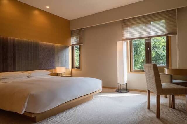 アクセントウォールや窓まわり、家具などに白木を使い、落ち着いた色調で構成された親しみのある客室です。最もコンパクトな客室タイプですが、28平米とゆとりのある広さ。幅180cm × 長さ203cmのベッドとデスクが置かれ、2名まで宿泊可能。和紙でできた行灯風のフロアライトに趣を感じます。
