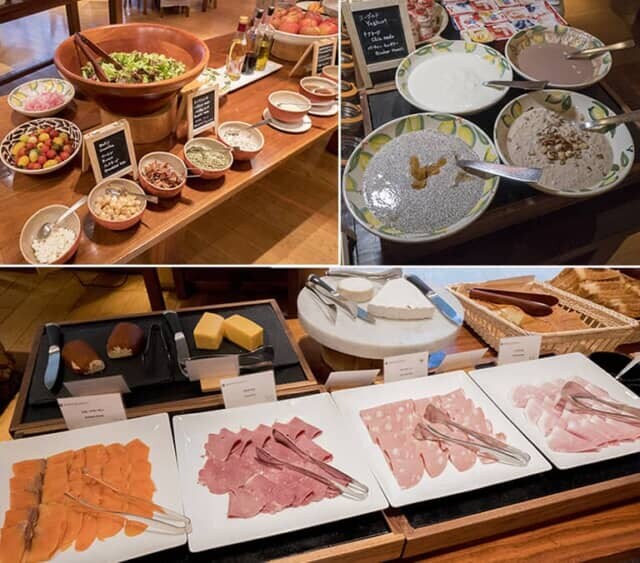 朝食は多くのゲストで賑わっていました。運よく窓際の席に座れると枯山水の日本庭園が眺められます。朝食の定番、ソーセージやベーコンをはじめ、ブロッコリーやジャガイモ、しめじなどグリル野菜が充実。デニッシュパンやフルーツ、国産豚「レッグハム」など、多彩な料理を用意します。