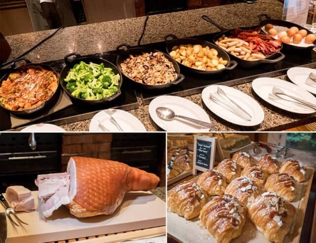 ビュッフェ台に置かれた大きな塊の「レッグハム」は、シェフが目の前でカットして焼き上げます。ステーキのように大きなハムは、柔らかくジューシーで香ばしい香りも楽しめます。メイン料理並みに存在感抜群の一皿でした。