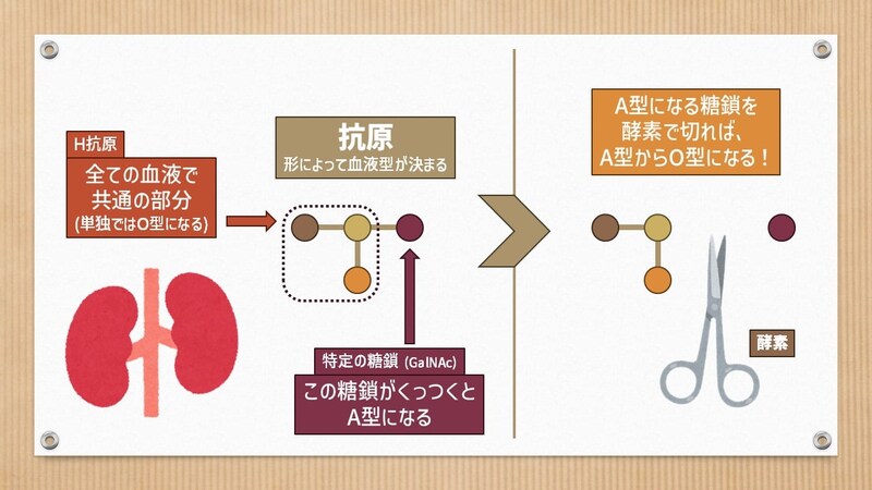 そのとある方法とは、細菌から見つかった酵素を使うこと。この酵素は、血液型を決める糖鎖と反応して除去する性質があるのよね。この酵素を使えば、原理的には、他の血液型の臓器をO型の臓器に変換させることが可能になるよ。患者ではなく臓器の方にアプローチする方法なので、患者が受ける負担も最小化するよ。