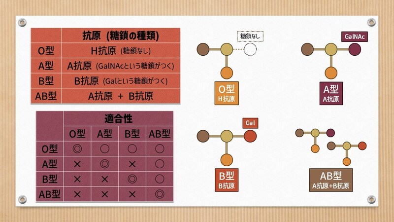 ABO血液型は、簡単に言えば、細胞の表面にある「抗原」と呼ばれる部位の形によって決まるよ。この抗原の形は、最も基本となる「H物質」を基盤に、どの種類の「糖鎖」がくっついているかによって決まるのよね。O型はこのような血液型を決定する糖鎖を持たないため、H物質を基盤としたH抗原を持つよ。一方で、A型とB型はH物質にそれぞれ決まった糖鎖を持つためA抗原とB抗原を持ち、AB型は両方の糖鎖を持つためにA抗原とB抗原をダブルで持っているよ。
