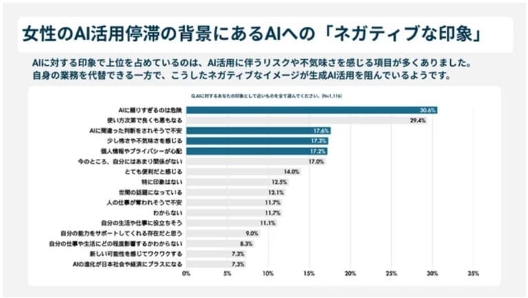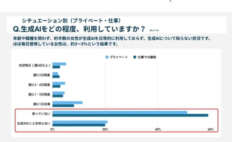 WAIJが20〜50代の女性1,116人を対象に行った調査によると、AIを「日常的に利用している」と答えた人はわずか3〜5%。半数以上が「使ったことがない」と回答しました。