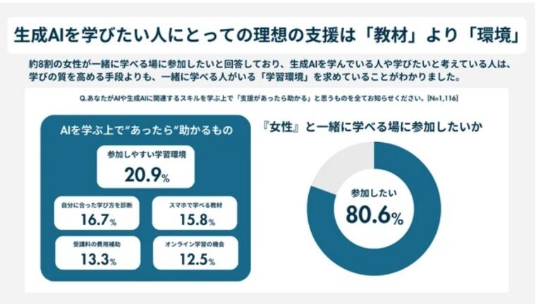 一方で「女性同士で学べる環境があれば参加したい」と答えた人は8割以上。教材よりも「学習環境」を求める傾向が明らかになりました。