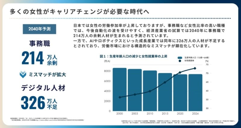 日本では女性の労働参加率が上がる一方、AIによる自動化で事務職など女性比率の高い職種は減少すると予測されています。2040年には214万人の事務職雇用が余剰になる一方、AI・ロボティクス分野では326万人の人材不足が見込まれています。つまり「なくなる仕事」と「新しく生まれる仕事」が共存する時代が到来しているのです。