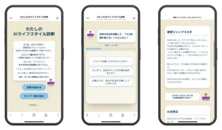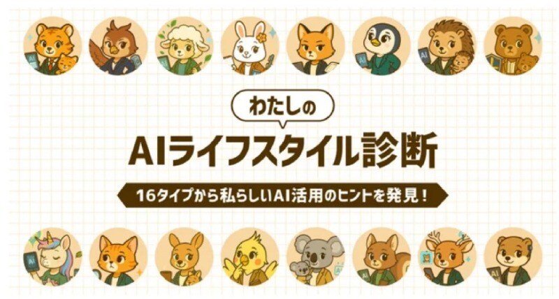 これは11項目の質問に答えるだけで、自身のライフスタイル、働き方、価値観に合ったAIの使い方がわかるという画期的なアプリです。合計で16の診断結果があり、それぞれ親しみやすい動物のイラスト入りで分かりやすいアドバイスもついています。