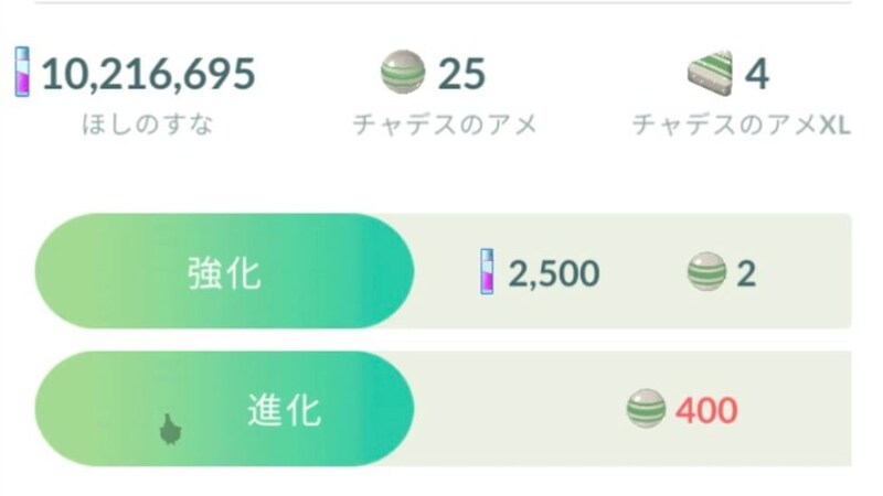 チャデスのアメの入手手段が、★1レイドバトルor相棒にして歩き回ることに限られている現状を考えると、400個のアメを集めるには気が遠くなるような労力がかかることは自明。