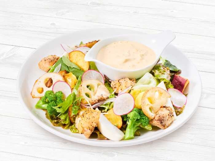 チキンと根菜の彩りサラダ たまごソース添え