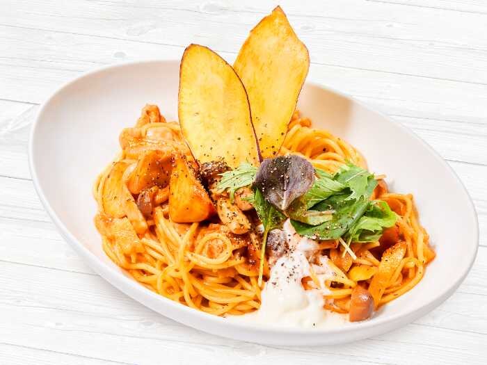 「さつまいもづくしのブラウンソースパスタ(税込1,280円)」や「煮込みハンバーグのパイ包み(税込1,680円)」のほか、「チキンと根菜の彩りサラダ(税込1,250円)」でヘルシーに秋を満喫。