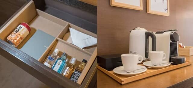部屋のサイドボードにはネスプレッソのコーヒーマシンやケトルのほか、すぐに使えるようにコーヒーカップも置かれていました。ミニバーにはウォッカやスコッチ、バーボン、ジンをそろえます。