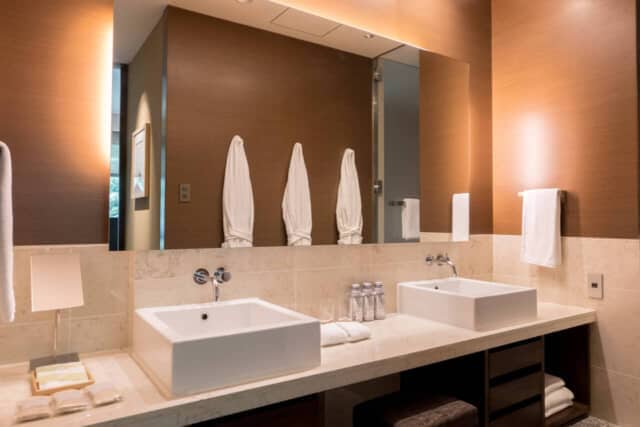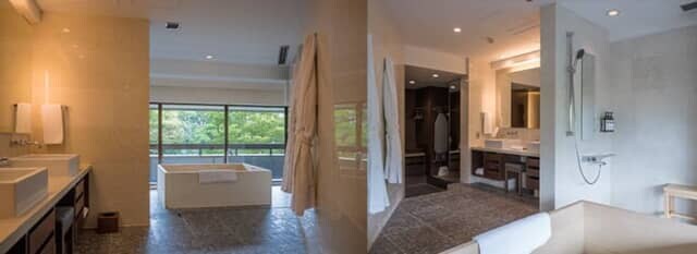 バスタブが置かれた窓際まで御影石が敷き詰められた上質な水回り。洗面にはダブルベイシンを採用し、バスローブも架かるほか、2人がそれぞれ使えるオープンクローゼットもありました。