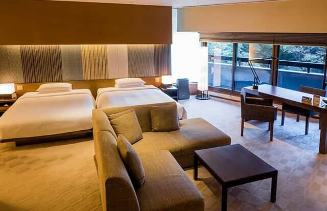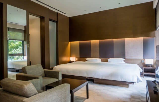 錦鯉が泳ぐ庭園を間近に見られる1階の「エグゼクティブスイート」は、それぞれキングとダブルをラインアップ。6畳の和室とゆとりのあるリビングベッドルームの2部屋からなる70平米の客室です。