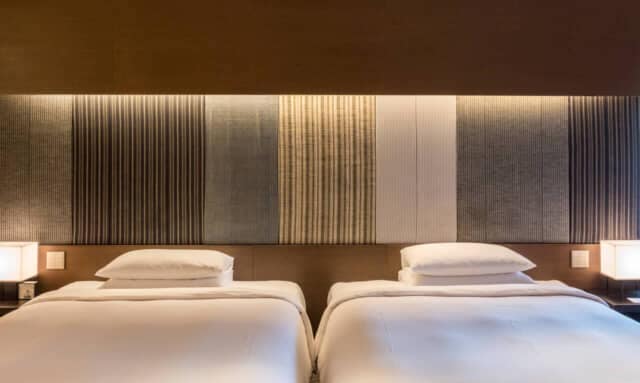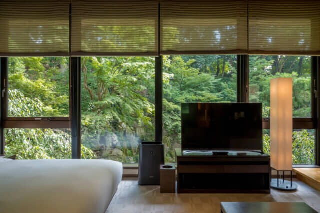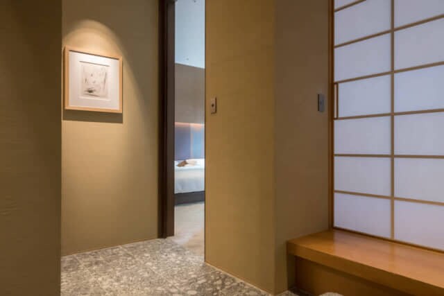 それぞれの客室はオーセンティックで落ち着いたデザインと共に、着物の生地が彩るヘッドボードや柔らかな光を投げかける行灯風の照明など、さりげない日本の伝統美を配します。寝具を整えるターンダウンサービスも希望によって対応可能です。