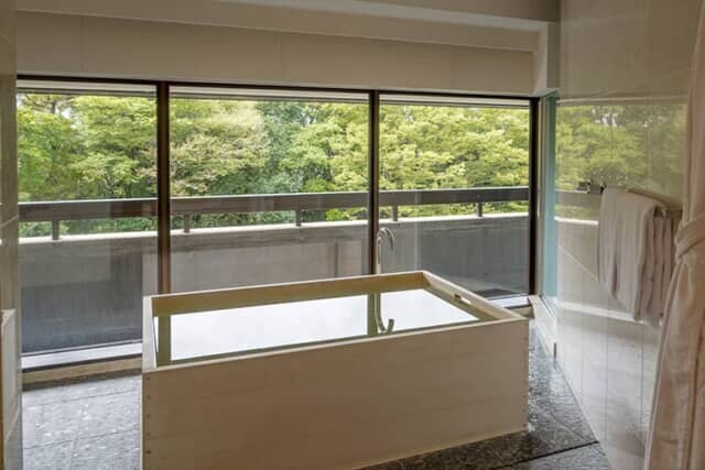 これまでに利用した客室のヒバのバスタブとしては最大の大きさで、2人で入ってもたっぷり余裕がある贅沢さ。湯舟の前は深い緑が広がって解放感満点のバスタイムを楽しめます。