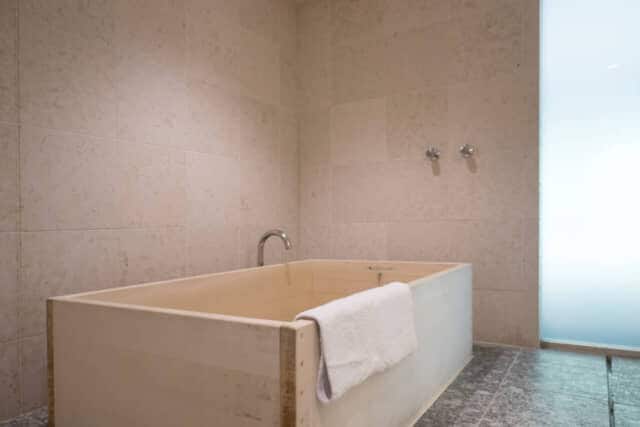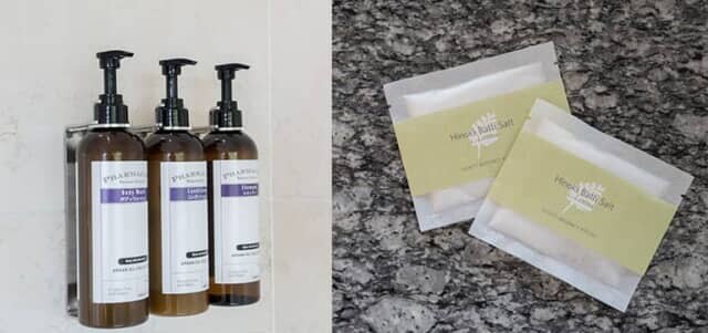 シャンプー、リンス、ボディーソープは、カナダ発のオーガニックブランド「ファーマコピア」のアルガンオイルコレクションをそろえます。バスソルトはヒノキオイルをブレンドしたヒマラヤ岩塩で、針葉樹の爽やかな香りに包まれました。