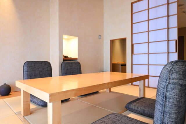 茶室をイメージして、正座をしながら部屋にはいる “にじり口” がある珍しい作り。テーブルの下は掘りごたつにすることも可能で、足を延ばしてくつろげます。和室からも庭園を眺めることができました。