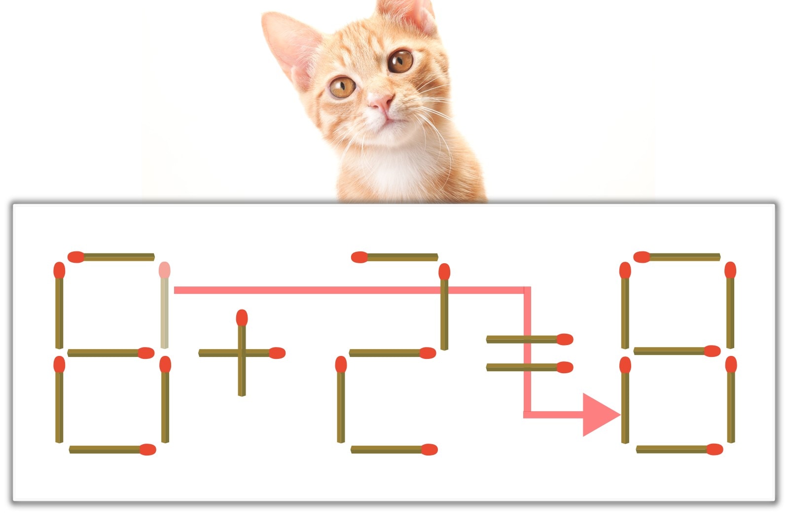 「8」のマッチ棒を1本、右にスライドさせて「8」を作り、「6+2=8」にする。※解答は複数ある場合があります。