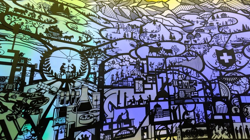 切り絵細工はスイスの郷土芸術のひとつ。アルプスの名峰や氷河に囲まれた観光地「グリンデルワルト」をはじめ、スイスの歴史や伝統、文化が1枚の紙の中に精緻に描き込まれています。