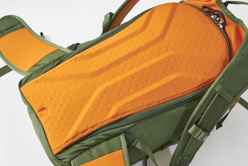 フロントパネルはバックパックの正面部分。大きなフロントポケットが付いているものが少なくない。雪山で使うことを想定したバックパックには、フロントにショベルやプローブなどアバランチギアを収納できる専用ポケットがついているものも多い。Solden32は「Jジップフロントパネル」という名称で、J型のジッパーですぐにアバランチポケットにアクセスできる。