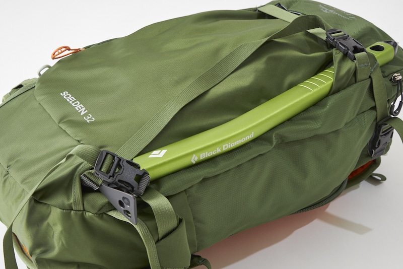 アックスを装着するためのホルダーがついている。その上からサイドコンプレッションストラップをかければ、より確かな固定に。