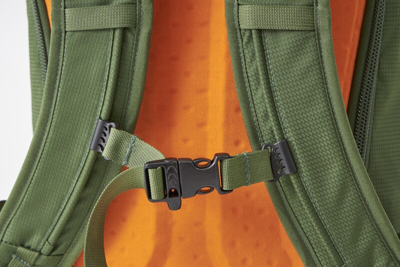 バックパックを背負うための肩紐がショルダーハーネス。リュック全体を肩から背中に安定させる役割を果たす。左右のショルダーハーネスの幅を調節するためのベルトがチェストストラップ。リュックの荷重でショルダーハーネスが体の外側に開くのを防ぎ、リュックと身体とフィットさせる役割を果たす。滑走時には、このチェストストラップいかんで安定感が変わるため、役割は特に重要だ。