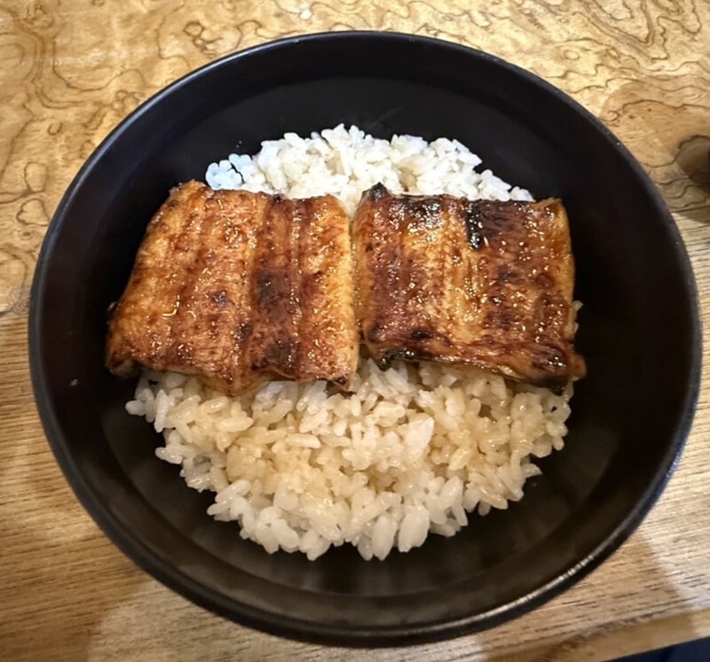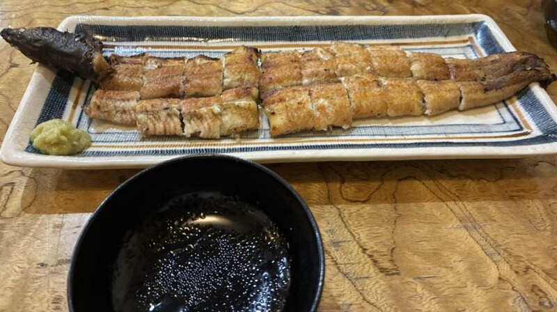 先にうな重、うな丼をいただいていると白焼が。炭火で焼き上げられパリっとして香ばしいうなぎ。わさびと醤油でいただく。お昼ということもありオーダーしていないが、お酒を飲みながら食べると至福の時間かと思われる。機会があれば是非どうぞ。