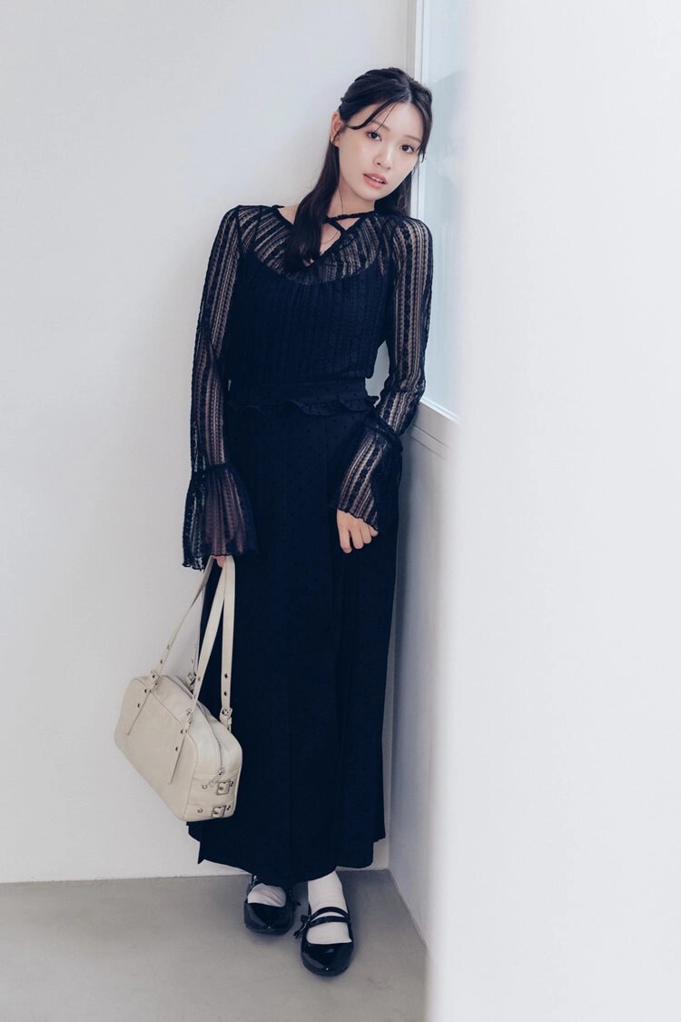 重たくなりがちなオールブラックはシアー素材で抜け感を出すのが重要。Iラインを意識すれば、より大人っぽさがマシマシに。